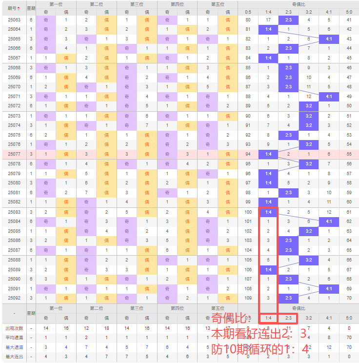 上期奇偶比:2:3,近10期奇偶比出现情况:1:4、4:1、3:2、2:3、2:3、3:2、1:4、2:3、4:1、2:3,最近10期出现3期3:2,出现3期2:3,出现2期4:1,出现2期1:4,出现0期5:0,出现0期0:5,根据近10期规律本期看好连出2:3,防10奇循环的1:4,综上所述推荐奇偶比推荐:1:4,重点关注:2:3。