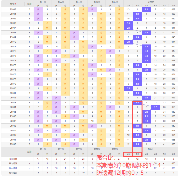 上期质合比:1:4,近10期质合比出现情况:1:4、3:2、2:3、2:3、2:3、1:4、2:3、1:4、2:3、1:4,最近10期出现1期3:2,出现5期2:3,出现0期4:1,出现4期1:4,出现0期5:0,出现0期0:5,根据近10期规律本期看好10期循环的1:4,防遗漏12期的0:5,综上所述推荐质合比推荐:0:5,重点关注:1:4。