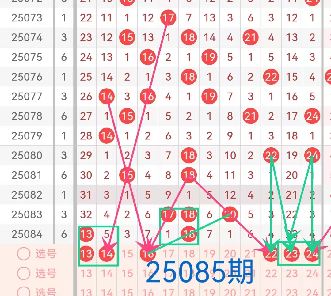 2. 二区(13-24):上期该区间开出两个号码16和18。号码13在遗漏32期后终于开出,且与前期号码12形成斜连的走势。号码18重复开出,形成重号的形式。考虑近期该区间较热,本期考虑会有1-2个号码继续开出。因此,本期可以关注该区间内近期遗漏次数较大的号码,如13、16、23这些号码在走势上表现出一定的稳定性,且与前几期出号形成呼应,有望出现在本期开奖中。号码14、22、24在画线走势上,有较好的出号走向,本期有望出现。