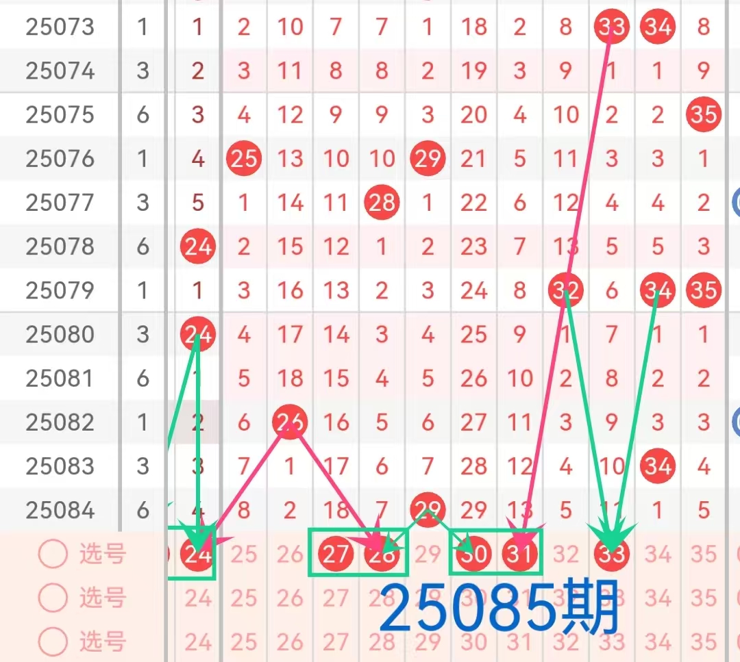 2. 凤尾号码分析:凤尾号码(前区最大号码)上期是29。这是一个大的凤尾,过去十期内,凤尾号码多集中在18到35之间,其中3字头号码表现较为活跃。因此,本期应重点关注26-35区间的数字,特别是号码27、30、31、33