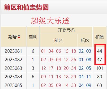 近五期大乐透开奖号码前区和值依次为44→47→101→80→63。前区和值均值为67。前区和值振幅为57,前区和值修正振幅为46。基于动态平衡干预以及波动趋势衡量,本期前区和值推测区间为21-113。基于风险对冲策略,本期前区和值区间缩水为48-98。基于前区和值分析,本期前区质数数量倾向于1-3枚。