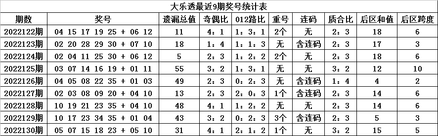 后区跨度:后区近9期跨度分别开出6-3-6-10-2-6-6-3-5,跨度奇偶比为3:6,上期跨度上升2个点位,本期防跨度重复开出5。