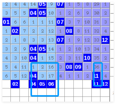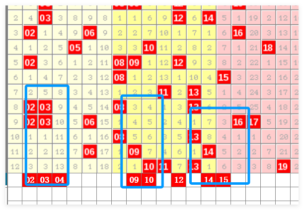 接着,我们看一下后区上期开出了0411一冷一热一奇一偶本期我们主要看一下还是以小大为主,小号还是要重点看一下020405,大号呢,我们要注意一下十一十二这里。