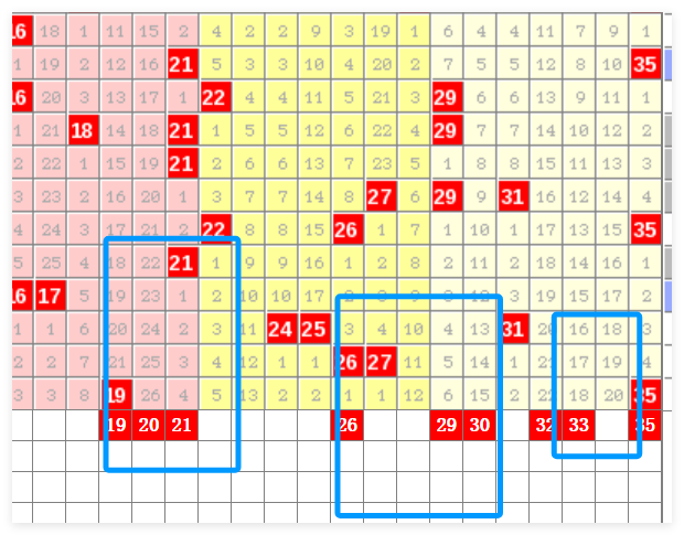 接着,我们看一下三分区从24号到35上一期开出了一个号码35。那么本期的话,这个35大概率是要往左进行运动。那么往左进行运动的位置,一个是那个32这个位置,一个是26.29.30这个位置。所以说,三分区的定位的一个是我们考虑2627有两码回补,要组合搭配29.30.和26.29.30.32.33三分区的定位,也就是在这几个号码之间去选择