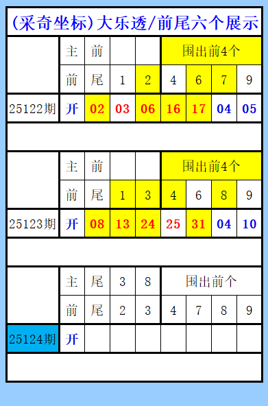 本期看好相生或相克尾号,开出的范围是3码至4码之间。近9期开出五行尾号分别是,115期前区尾号五行全、116期前区尾号五行缺土木0+5+3+8、117期前区尾号五行缺火2+7、118期前区尾号五行缺土0+5、119期前区尾号五行全、120期前区尾号五行缺金4+9、121期前区尾号五行缺土金0+5+4+9、122期前区尾号五行缺土金0+5+4+9、123期前区尾号五行缺火2+7。看好3期之内重五行尾号开出2号以上规律,概率在九成左右。相生或相克尾号有开出4码的可能性,大家可以筛选一下,本期看好的五行六个尾号是(2+7)(3+8)(4+9)
