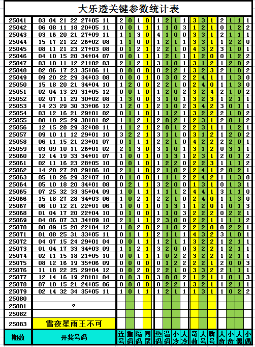 以下是作者手工统计的大乐透关键参数统计表,对喜欢参数分析、过滤缩水、选号胆杀的技术性大乐透爱好者有所帮助,其它读者可略过不看。