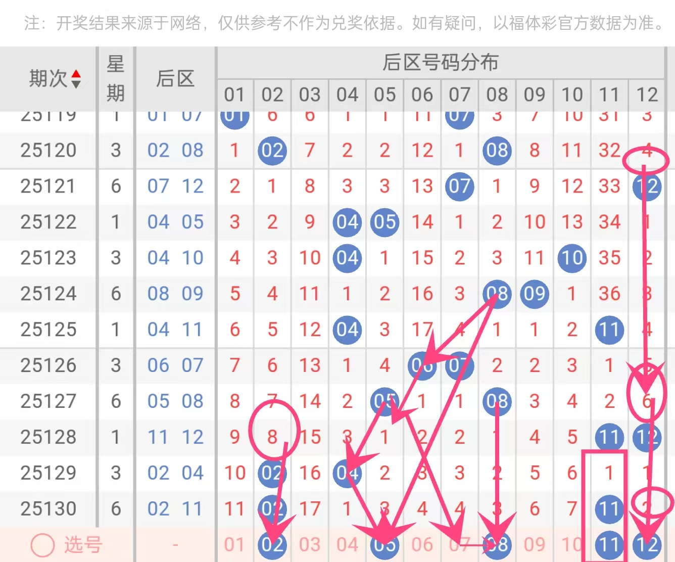 推荐后区5号码:02、05、08、11、12
