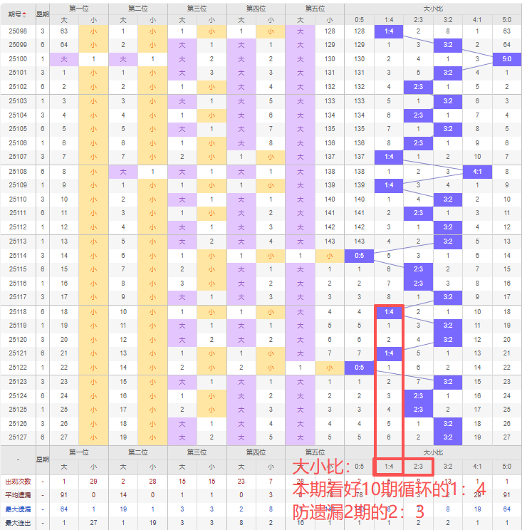上期大小比:3:2,近10期大小比出现情况:1:4、3:2、3:2、1:4、0:5、3:2、2:3、2:3、3:2、3:2,最近10期出现5期3:2,出现2期2:3,出现0期4:1,出现2期1:4,出现0期5:0,出现1期0:5,根据近10期规律本期看好10期循环的1:4,防遗漏2期开出2:3,综上所述推荐大小比推荐:2:3,重点关注:1:4。