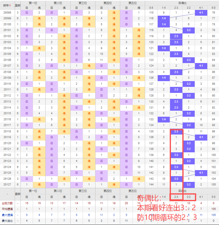 上期奇偶比:3:2,近10期奇偶比出现情况:2:3、4:1、3:2、3:2、2:3、3:2、2:3、4:1、2:3、3:2,最近10期出现4期3:2,出现4期2:3,出现2期4:1,出现0期1:4,出现0期5:0,出现0期0:5,根据近10期规律本期看好连出3:2,防10期循环开出2:3,综上所述推荐奇偶比推荐:2:3,重点关注:3:2。