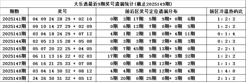 体彩大乐透第2025149期奖号为:24 26 30 31 32 + 05 12,各位号码遗漏期数分别为:5期、20期、0期、25期、0+3期、0期,前区号码遗漏总期数为50期,012路比为212,奇偶比为14,包含2个重复号码:3032。后区号码遗漏总期数为3期,和值为17,跨度为7