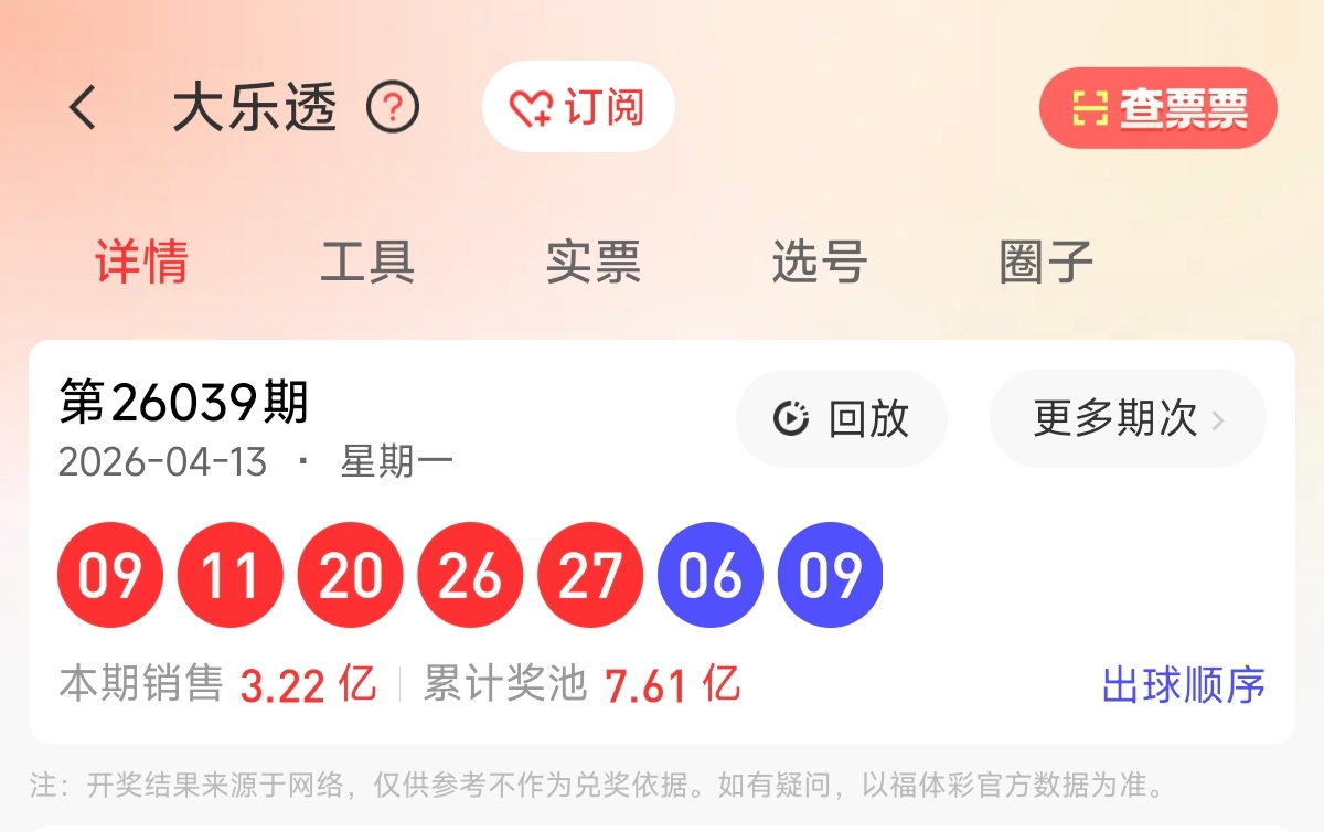 首先让我们回顾一下上期大乐透26039期的开奖为09、11、20、26、27,蓝球06、09 。前区和值93,前区跨18,区间比为2:1:2,奇偶比为3:2。