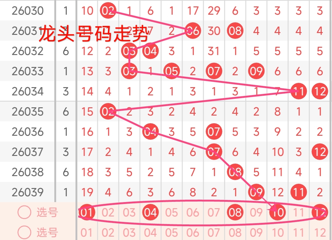 上期龙头号码为09,振幅上升了1点,开出奇数号码。从近期龙头号码的走势来看,近期龙头号码波动幅度较大。回顾近5期龙头,整体从低位02起步,逐步攀升至本期的09,已经走出连续五期的上升趋势,数值从2一路抬升到9,连续多期扎根在一区的高位区域,从走势的对称性来看,连续拉升后必然会进入回调周期,回调幅度大概率会回到一区中低位。预计本期龙头号码可以重点关注01-12区间开出。本期还需注意连续多期漏出的号码,需重点关注,有回补龙头号码的趋势。 综合考虑,本期龙头号码推荐关注:01、04、08、10、12。