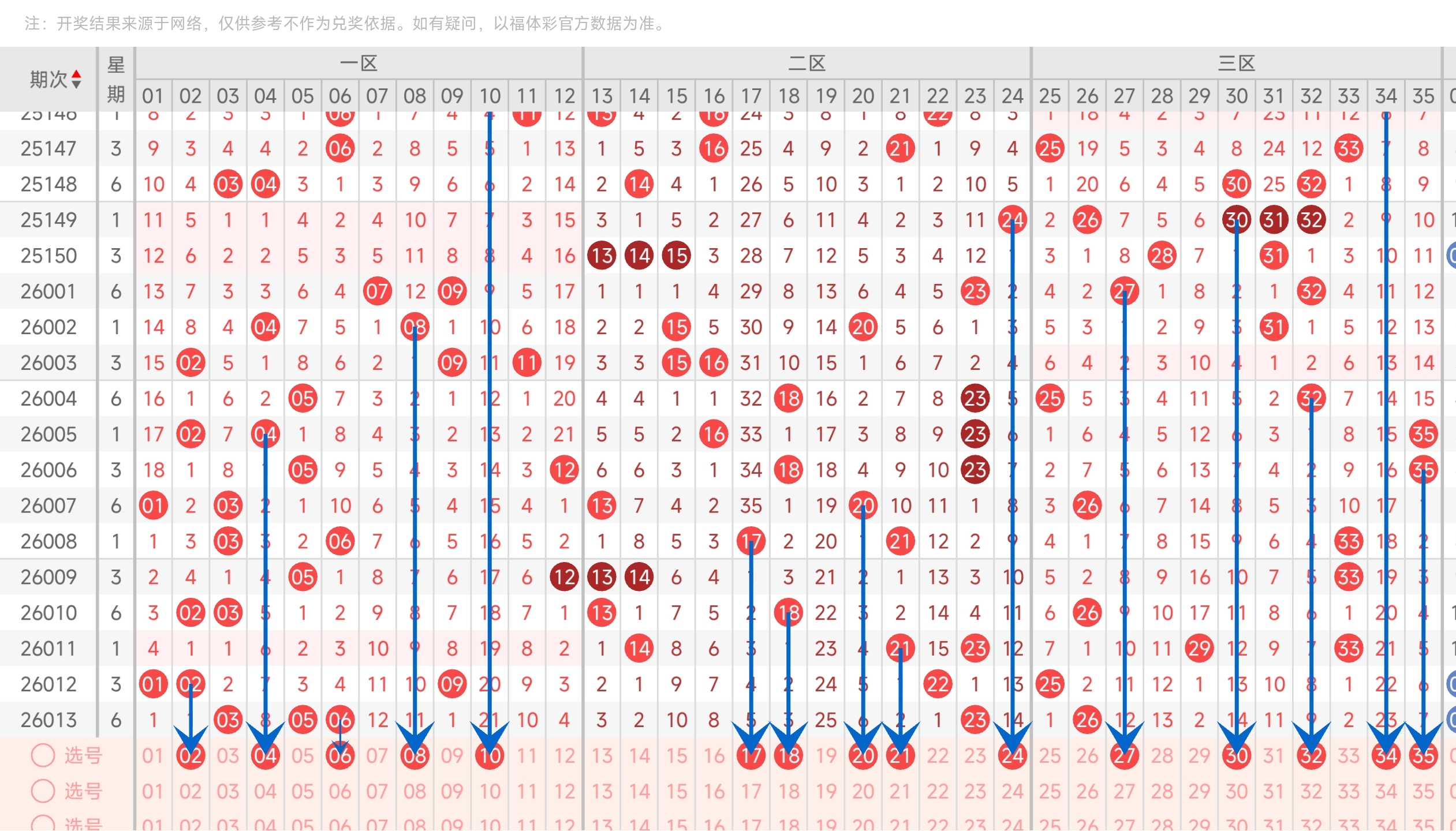 上期开出26号球,往前一期开出了25号。通过分析走势图,可以看到上期凤尾开了26,连续开了2期左边位置的号码,本期有可能开右边或者中间的号码,但左边的号码也可能继续开,所以本期均匀关注三区号码。最后再结合冷热号和遗漏期数,本期我们可以关注27,30,32,34,35等号。综上所述本期三区我们推测可能会开27,30,32,34,35等号码。