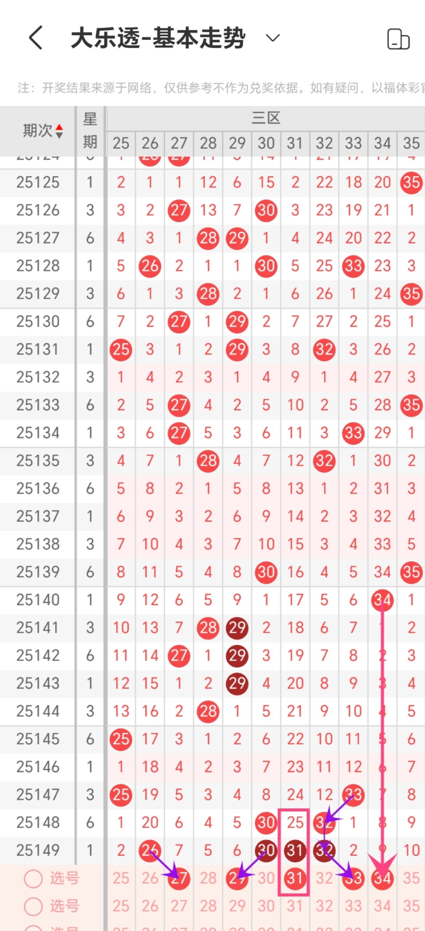 通过对周三重号出现的数量规律进行统计分析,本期考虑出号1-2个,即06-16-21-25-33出号1-2个