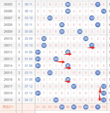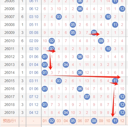 上图是体彩大乐透后区开奖号码走势分布图,我在上面走势图中标注出来的红色箭头表示的就是右边这个数字最近开出的都是偶数数字,你们看看上面的红色小箭头,已经连续4期开出偶数数字,那么本期右边这个数字关注出奇数,那么假设本期右边这个数字出奇数的话,那么范围就是05 07 09 11。