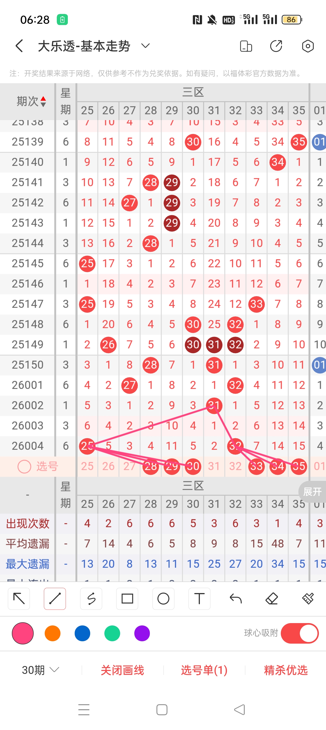 26004期开奖结果:5、18、23、25、32+5、9,奇偶比3:2,大小比3:2,和值112,012路113,邻孤传0邻5孤0传,同尾号5、25,传号无,连号无。总结完毕,下面开始本期分析。