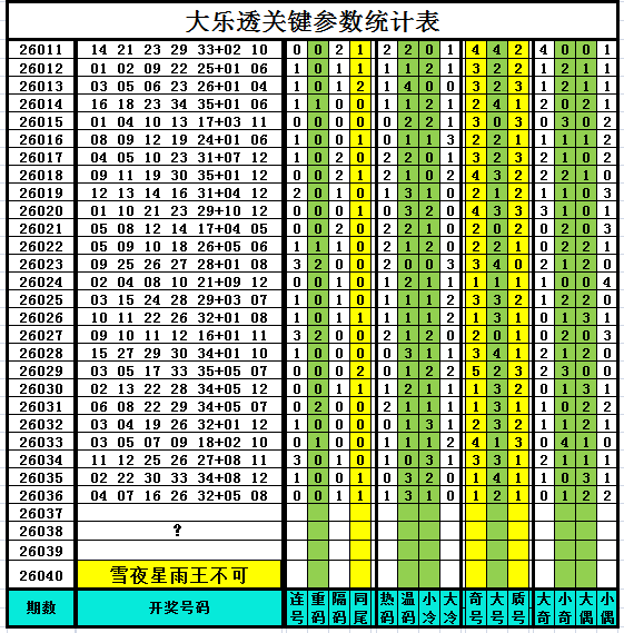 以下是作者手工统计的大乐透关键参数统计表,对喜欢参数分析、过滤缩水、选号胆杀的技术性大乐透爱好者有所帮助,其它读者可略过不看。