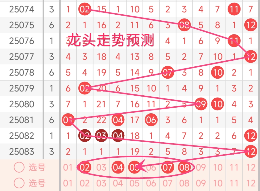 上期龙头号码为12,振幅上升了10点,开出偶数号码。近期龙头号码振幅波动比较大。观察近期开奖数据,龙头号码呈现出一定的波动性。上期龙头号码为 12,处于红一区最大位置。从近期龙头号码走势来看,呈现出跳跃性。本期龙头号码有望继续走低,可能在 01- 08 之间产生。较小的龙头号码往往预示着整体号码区间的下移。 本期还需注意连续多期漏出的号码,需重点关注,有回补龙头号码的趋势。 综合考虑,本期龙头号码推荐关注:02、04、05、07、08。