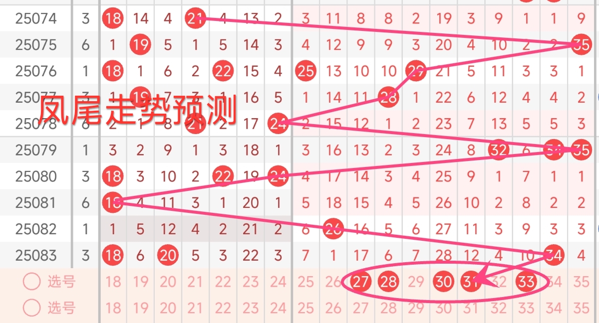 红球三区推荐(25~35):上期红三区开出1枚号码,号码为34,本期红三区建议出号1-2枚,本期红三区推荐关注号27、28、30、31、33。