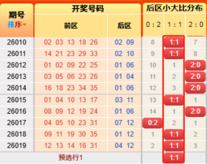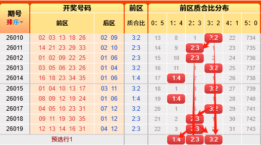 上期前区小大比4:1。言归正传我们继续用历史数据说话,前区小大比分成6051423324150(如图),我统计了一下历史出现次数,05出现107次、14出现517次、23出现980次、32出现822次、41出现356次,50出现55次,再看近10期小大比出现次数比为021511,通过历史数据对比观察以及根据遗漏对称理论原则,故本期我们选择2:3、3:2、4:1(具体精准方向请查看小车小大比精选)