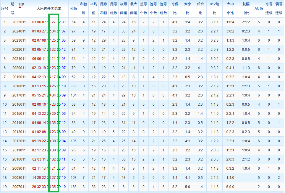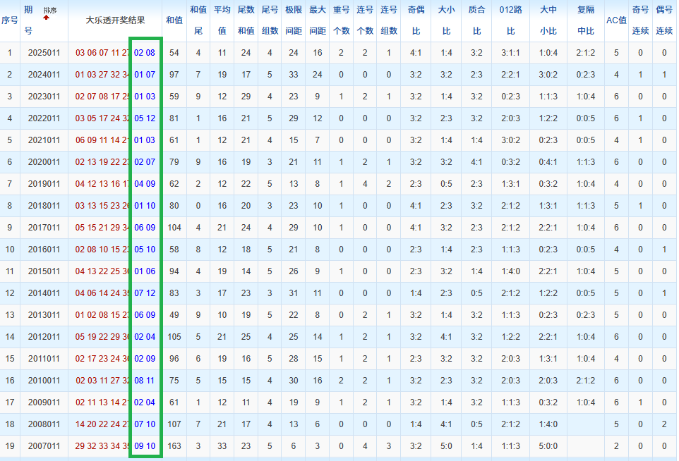 通过观察,我发现往年同期的开奖数据与本期号码之间存在显著关联。具体来说,在前区号码中,从第一位至第五位,通常会有约三个位置上的数字与往年同期相同位置的号码一致;而后区号码中,也有多期开奖结果直接包含了往年同期的数字。因此,我们可以借助往年同期各位置上的号码,作为分析本期开奖情况的重要依据。在此基础上,还可结合往年同期的其他相关条件,进行综合性的号码组合推荐。