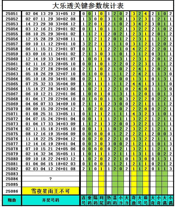 以下是作者手工统计的大乐透关键参数统计表,对喜欢参数分析、过滤缩水、选号胆杀的技术性大乐透爱好者有所帮助,其它读者可略过不看。