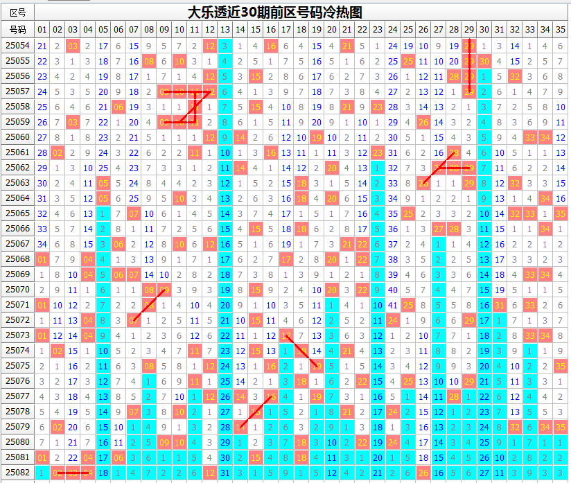 大乐透近30期前区号码冷热图(数字为遗漏期数,蓝色标记的为遗漏超过10期的大冷号)