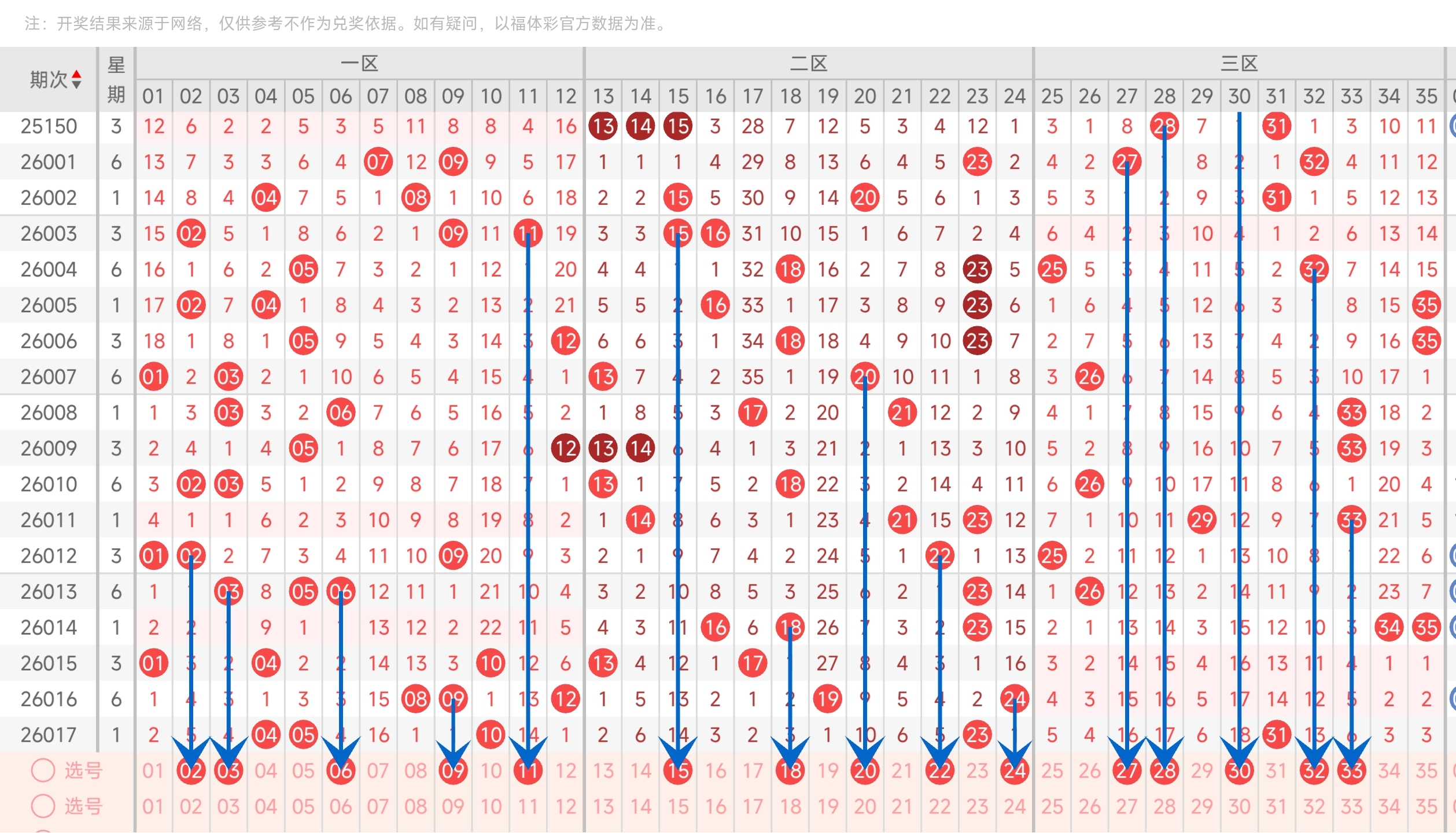上期开出了31号球,往前一期也没有开出号码。通过分析走势图,和我们上期推测中间号码可能回补一样,上期回补了31号球,本期中间的号码我们持续关注,其次是防左边的号码回补。最后再结合冷热号和遗漏期数,本期我们可以关注2728303233等号。综上所述本期三区我们推测可能会开2728303233等号码。