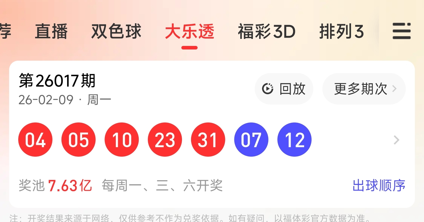 26014期大乐透文章推荐中命中1834353个红球,蓝球6