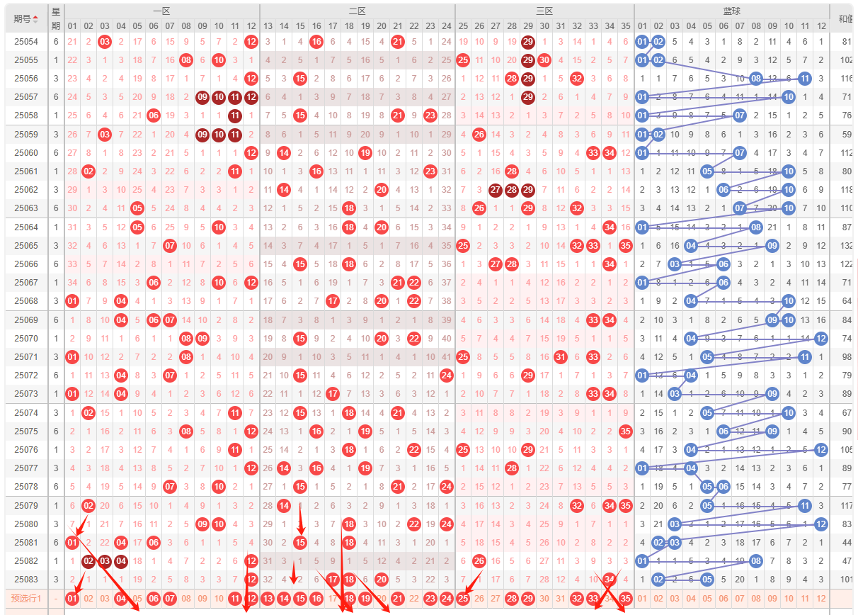 第三区间: 三区目前好冷,不是断区就是零散的落1-2个号。所以这是最难拿捏的。这样只能去用前一期的同尾,本期的斜走,另外一个就是感觉,再加一个一二区可能出号的同尾,经常会有同尾号,所以只能靠这种零星的信息去组合。本期三区重点看25.27.28.30几个号,明列号可就不选尾。