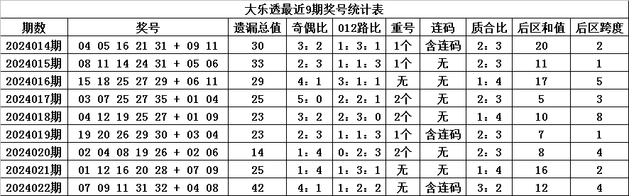 后区跨度:后区近9期跨度分别开出2-1-5-3-8-1-4-2-4,跨度奇偶比为45,上期跨度上升2个点位,本期防跨度转向下降,注意奇数跨度出现,关注跨度1