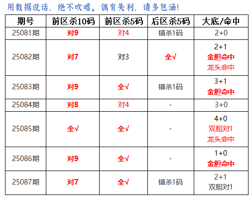 上期前区杀10码对8,杀5码全对,凤尾命中,后区胆码命中,大底命中1+1,本期再接再厉!