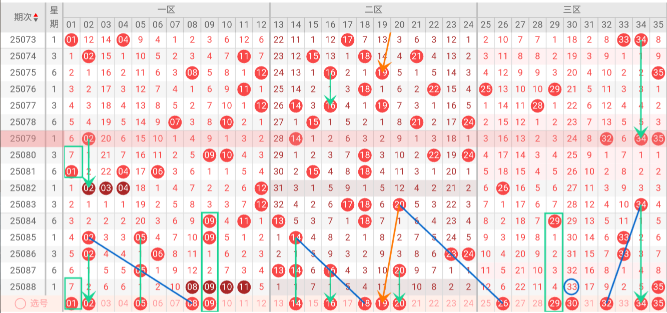 三区(25-35)分析:上期该区开出号码35,近10期占比18%,与上期相比+2%。本期无三斜连号趋势,隔码斜连走势:26 32。近10期有7期单码形态 ,26-31平均遗漏≥15期,概率仅0.3%远超理论值,按大数定律必破,本期出号范围大概在1-2枚,大概率弱势回暖至1码。推荐关注号码:26、29、30、32、35。