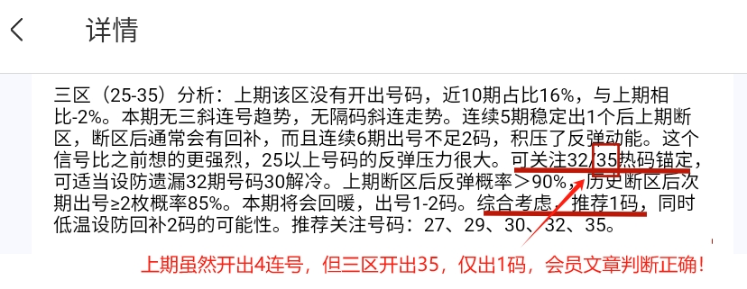上期虽然开出4连号,但三区开出35,仅出1码,会员文章判断正确!