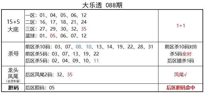 大乐透第2025088期奖号开出:08 09 10 11 35+ 05 11,三区比4:0:1,和值73,跨度27,蓝球号码05 11,双奇组合。