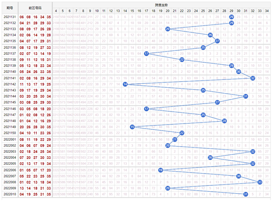 大乐透第5 个号码就是大乐透前区的最大数字,此时就可以利用位差与大乐透第5个号码两两组合,能不能排除下期废号,我们不知道,但是效果要靠数据来说话。
