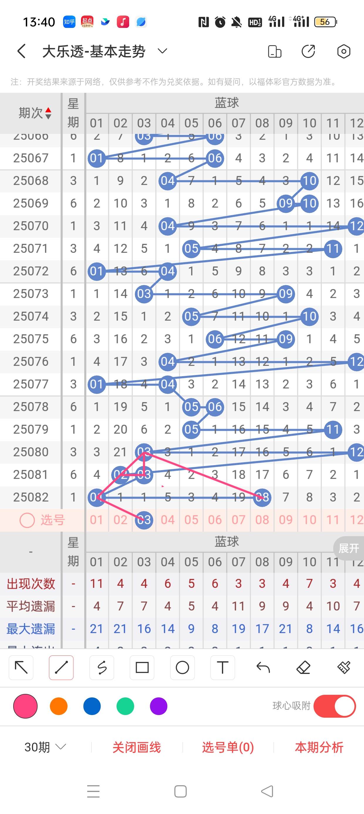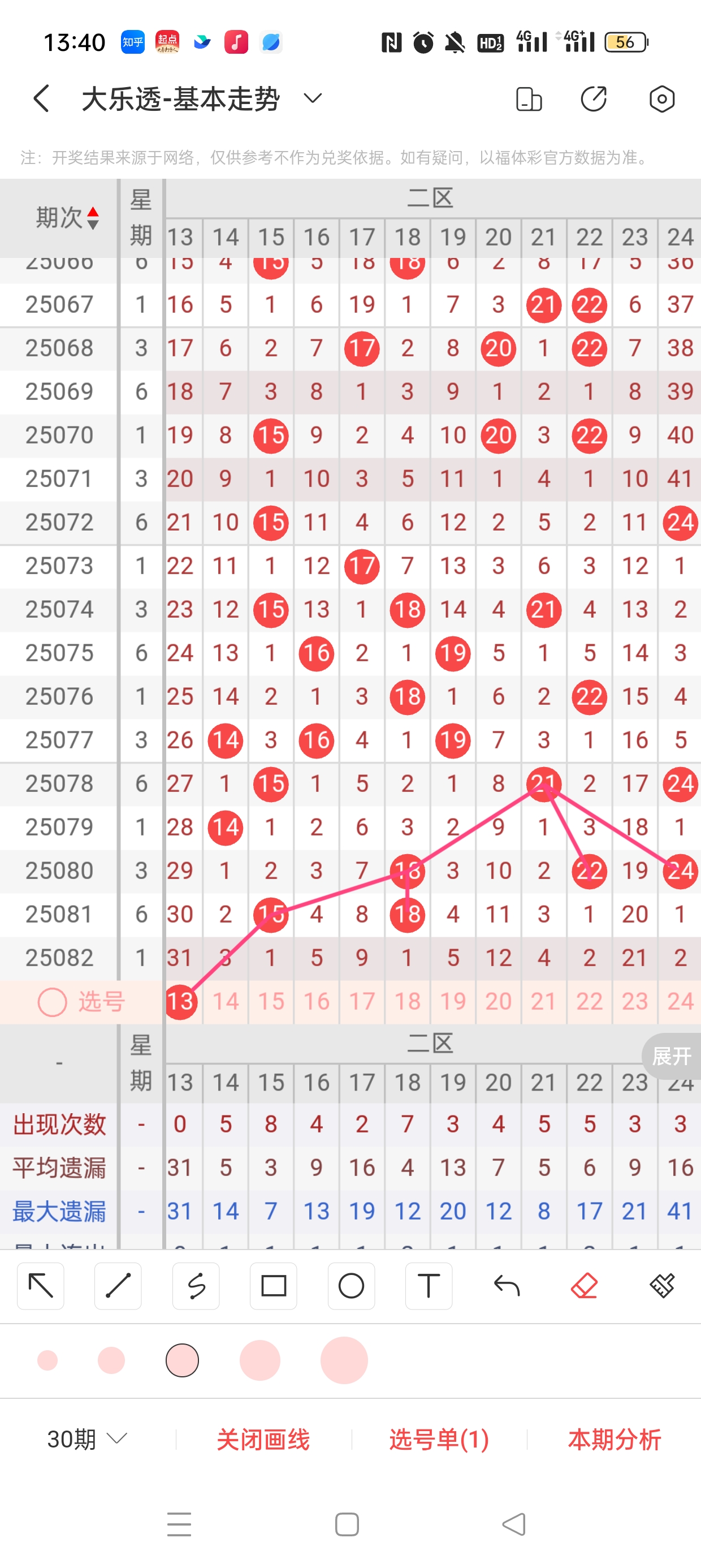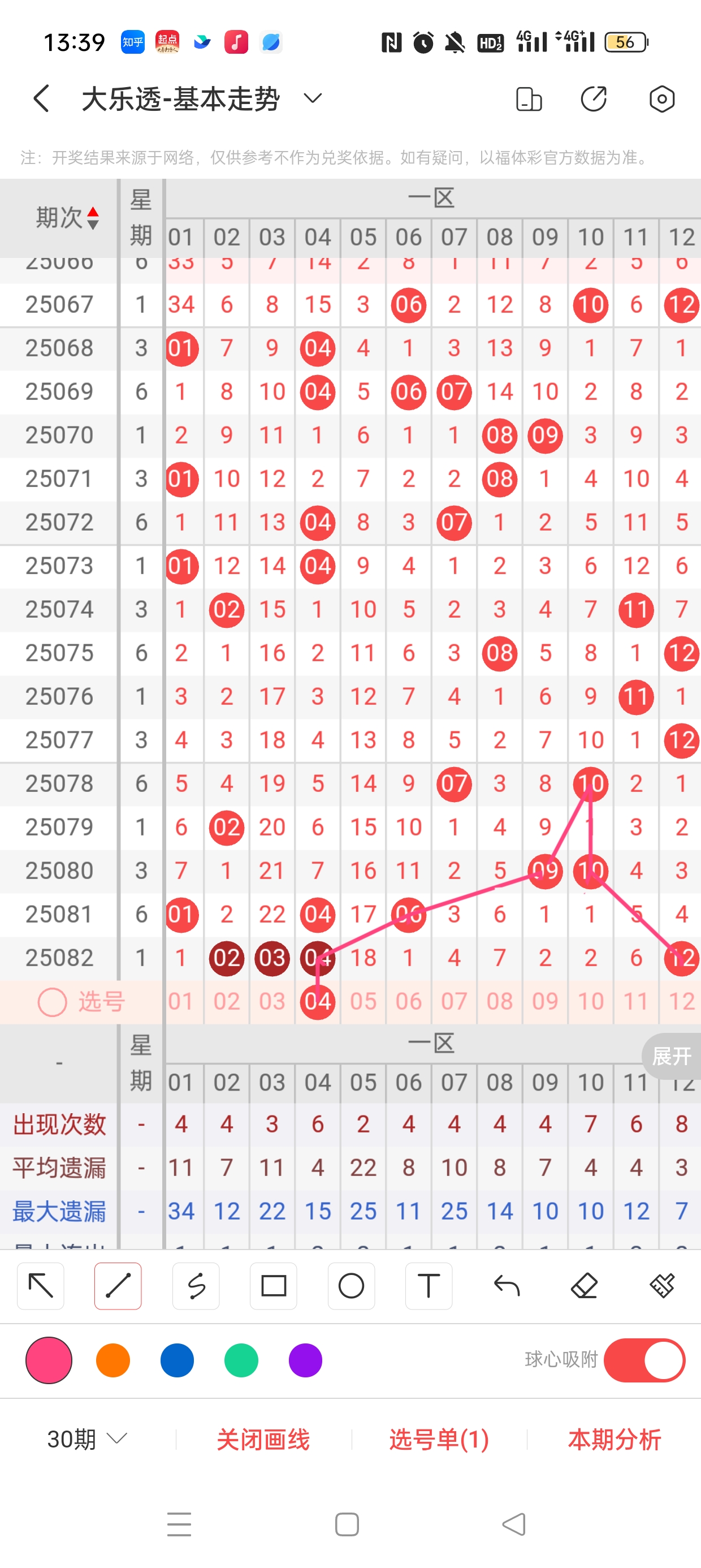 一区(1-12)近80期本区邻孤传39邻65孤3传,孤号热度高,本期着重邻传。近80期本区012路30:32:45,1/2路热度高,本期着重0路。4作为传号,呈现直落回补态势,需防。