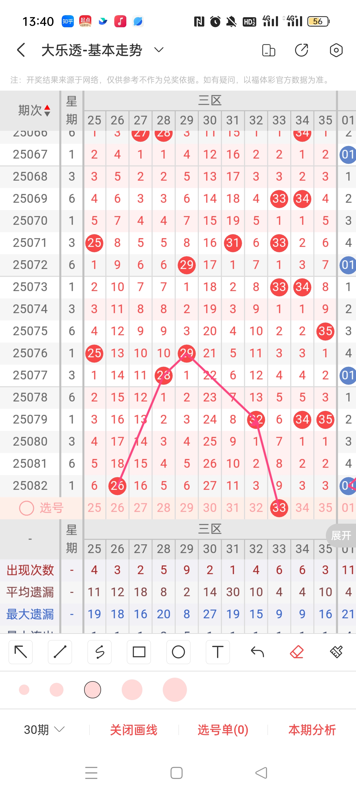三区(25-35)近80期本区邻孤传39邻62孤8传,孤号热度高,本期着重邻传。近80期本区012路27:37:41,1/2路热度高,本期着重重0路。33已遗漏9期,与32之间呈现向右遗漏递减态势,需防。