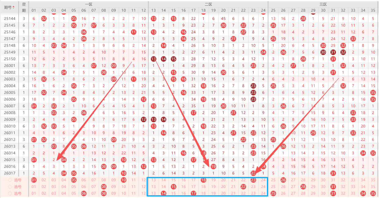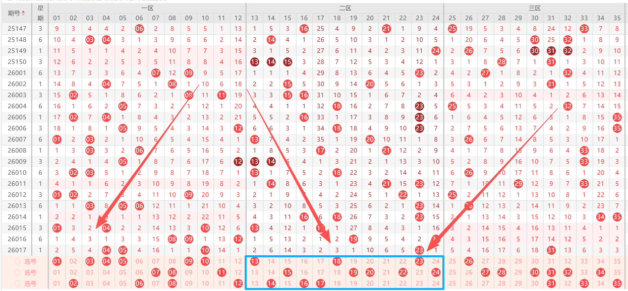 第三区:本期的凤尾,可以考虑31和34,35几个号码,3区号需要考虑25,26和28这几个号码。