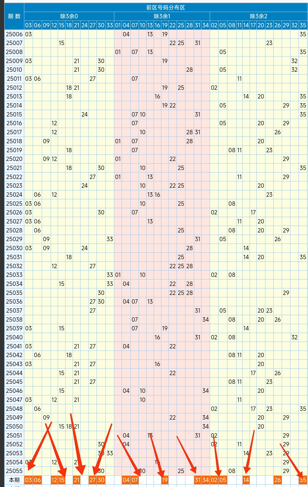 根据近100期走势,本期除三余0号码应该在0306 15 12 27 30中开出,除三余一号码应该在04 07 19 31 34中开出,除三余二号码应该在02 05 14 26 35中开出,经过本人仔细研究分析,本期除三余0号码应该在03 15 21 27中开出,除三余一号码应该在07 19 31中开出,除三余二号码应该在02 14 35中开出