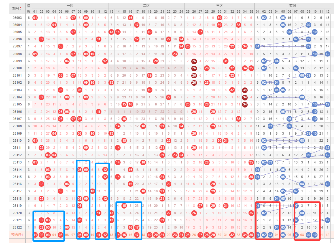 先回顾上期特征:奇偶比23,区间比是320,质合比为322个红球重号,2组连号,0个邻号,1个孤号,蓝球小小组合,奇数组合