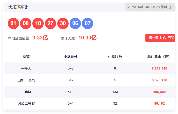 开奖结果回顾:上一期开奖号码01 08 18 27 30 +06 07