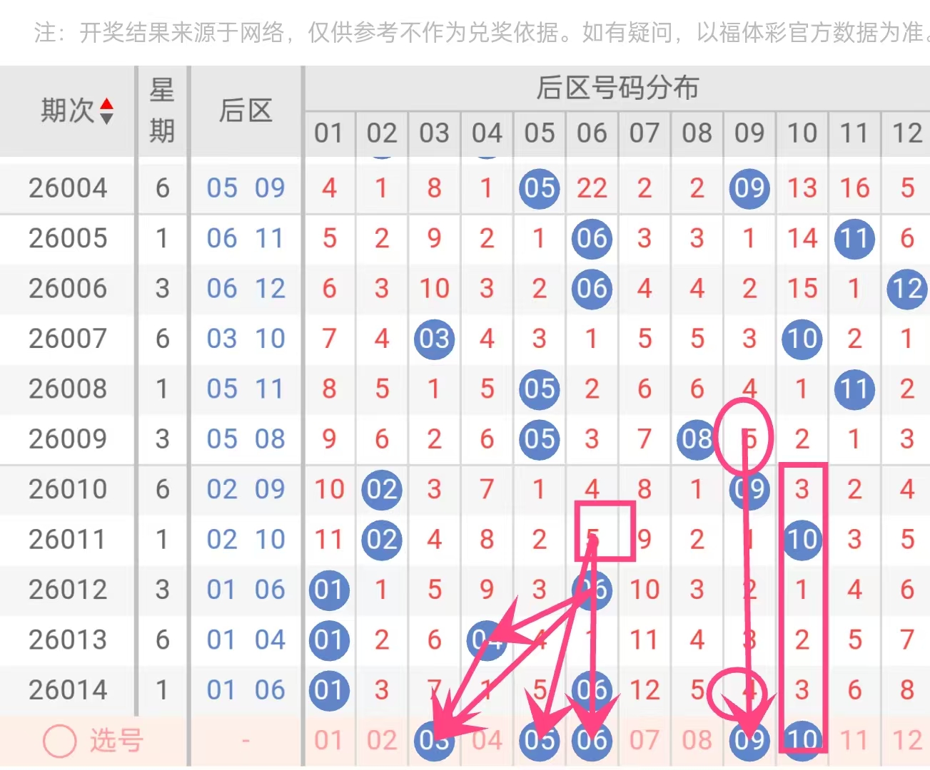 后区选择侧重“中间段反弹”与“小号延续”。03、05为近期后区中的温冷号,历史上常与01、02形成交替出现;06近期活跃,可作为延续号;09、10属于中段号(07-10),近期后区偏向小号(01-06),中段号有回补空间,且09在前期曾有出现。整体后区覆盖了1-10区间,避免与杀号重叠,注重奇偶搭配与跨度控制。