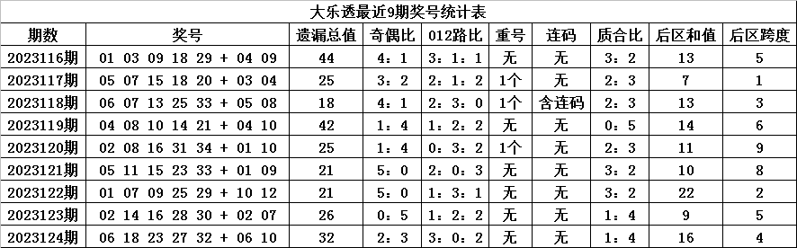 体彩大乐透第2023124期奖号为:06 18 23 27 32 + 06 10,各位号码遗漏期数分别为:5期、6期、2期、9期、10期+17期、1期,前区号码遗漏总期数为32期,012路比为3:0:2,奇偶比为2:3,没有开出重复号码。后区号码遗漏总期数为18期,和值为16,跨度为4。