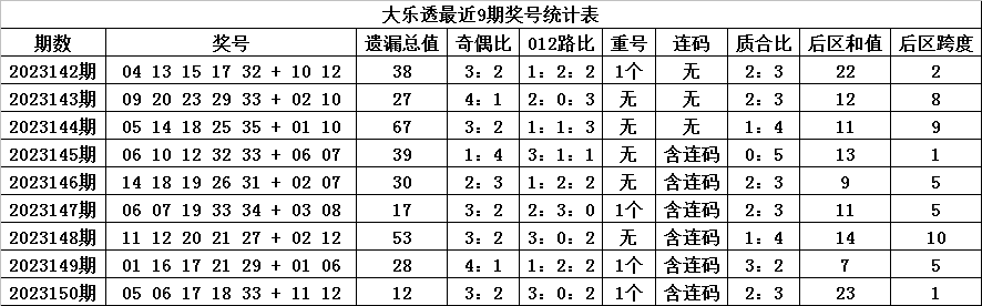体彩大乐透第2023150期奖号为:05 06 17 18 33 + 11 12,各位号码遗漏期数分别为:5期、2期、0期、3期、2期+16期、1期,前区号码遗漏总期数为12期,012路比为3:0:2,奇偶比为3:2,包含1个重复号码:17。后区号码遗漏总期数为17期,和值为23,跨度为1。