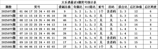 后区跨度:后区近9期跨度分别开出6-5-3-8-3-1-6-9-1,跨度奇偶比为6:3,上期跨度下降8个点位,本期看好跨度反向上升,预计开的偶数跨度,关注跨度6。