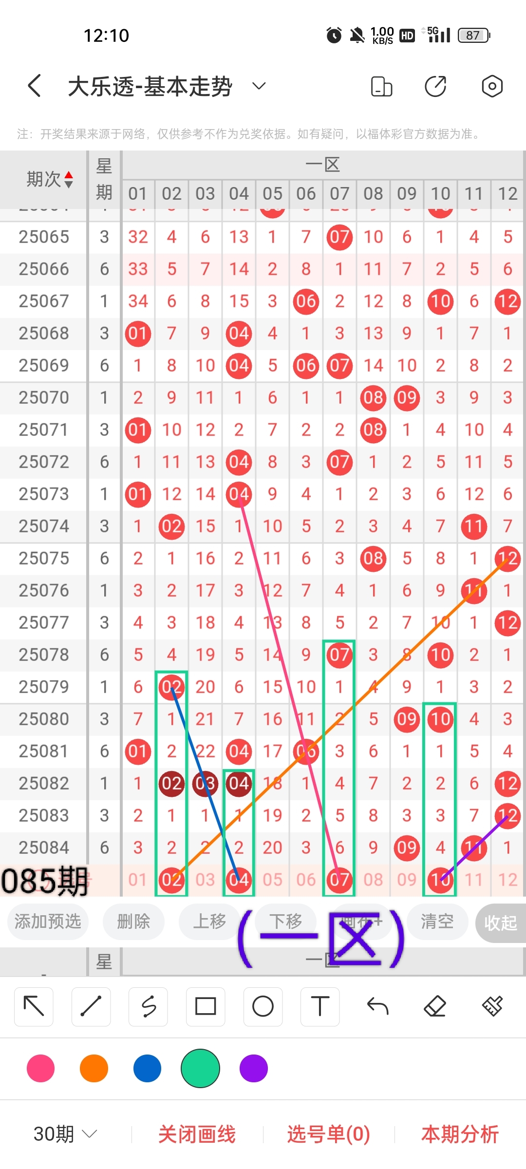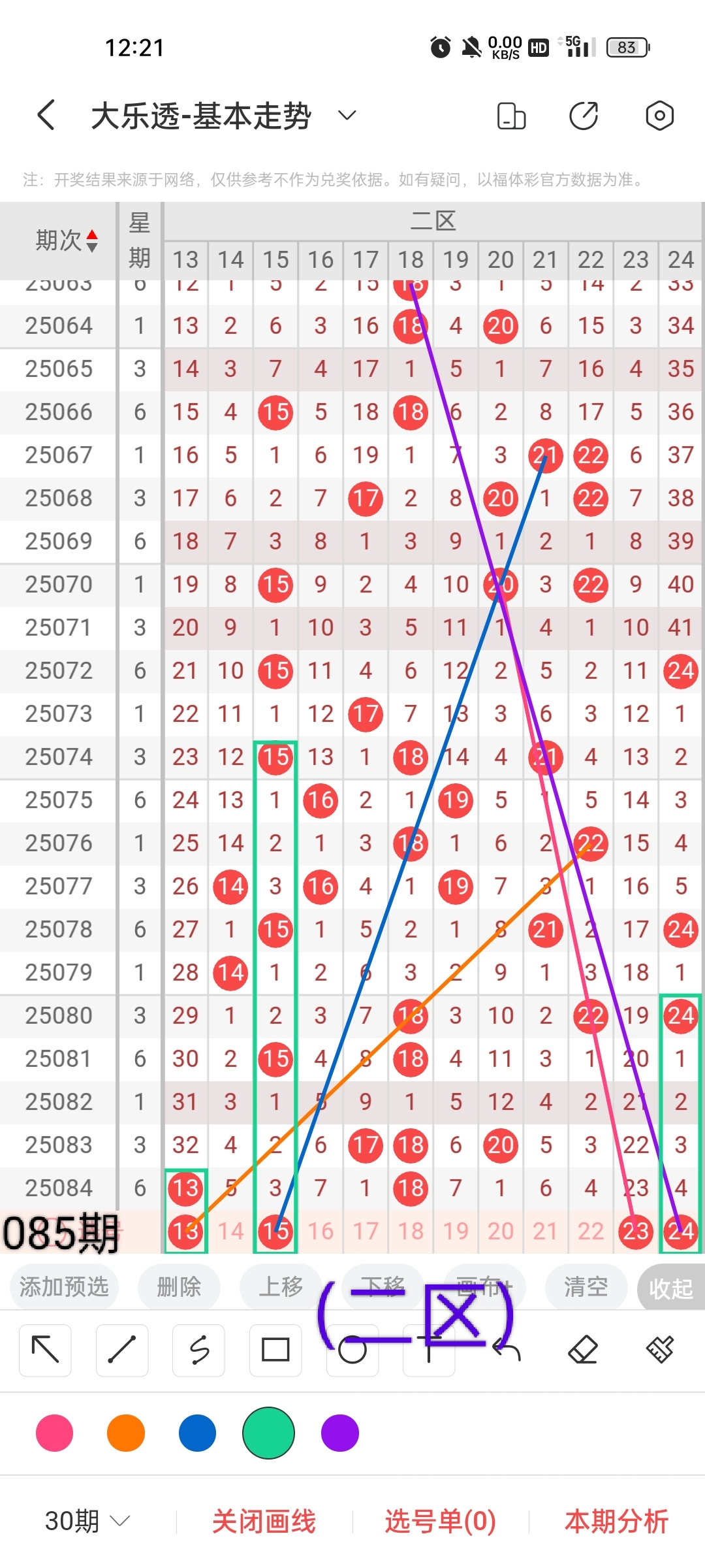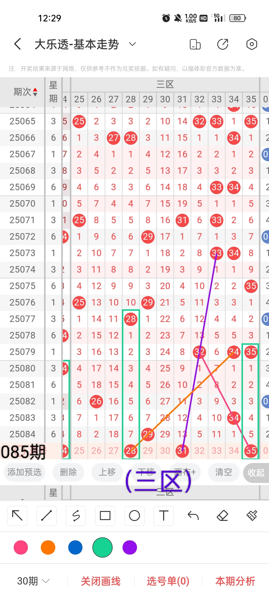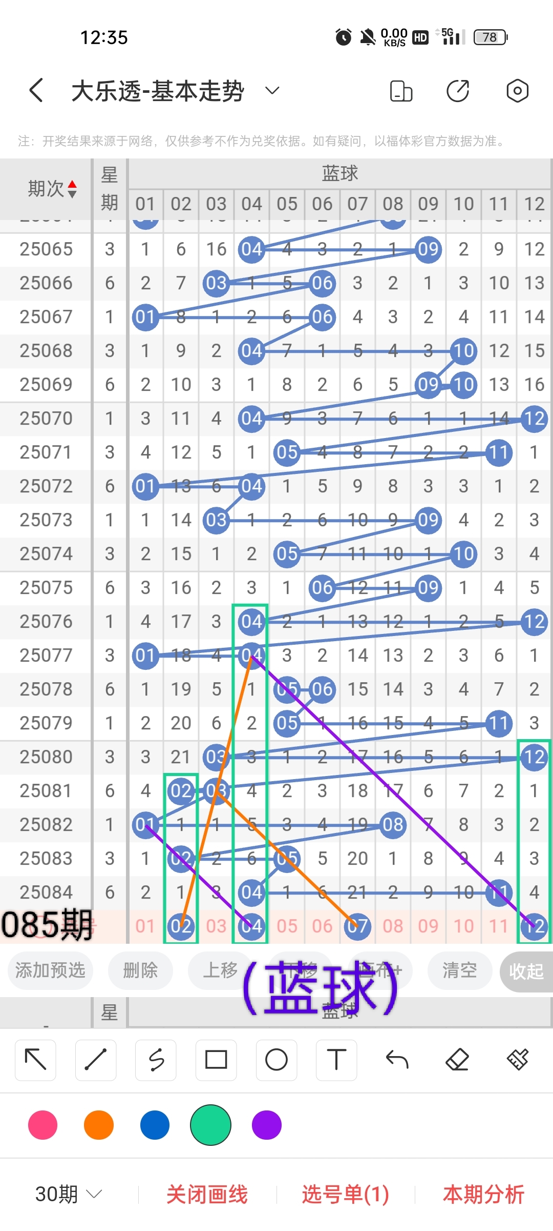 通过以上对上期的简单回顾,下面进入大乐透第2025085期(下面简称本期)的选号分析: