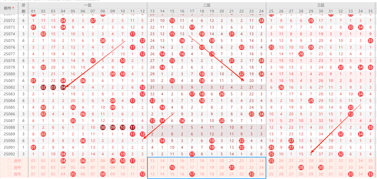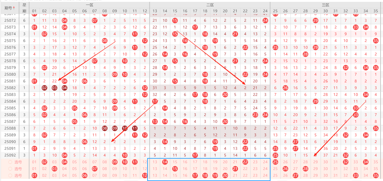 第三区:本期的凤尾,可以考虑30和33,35几个号码,3区号需要考虑25和28这几个号码。