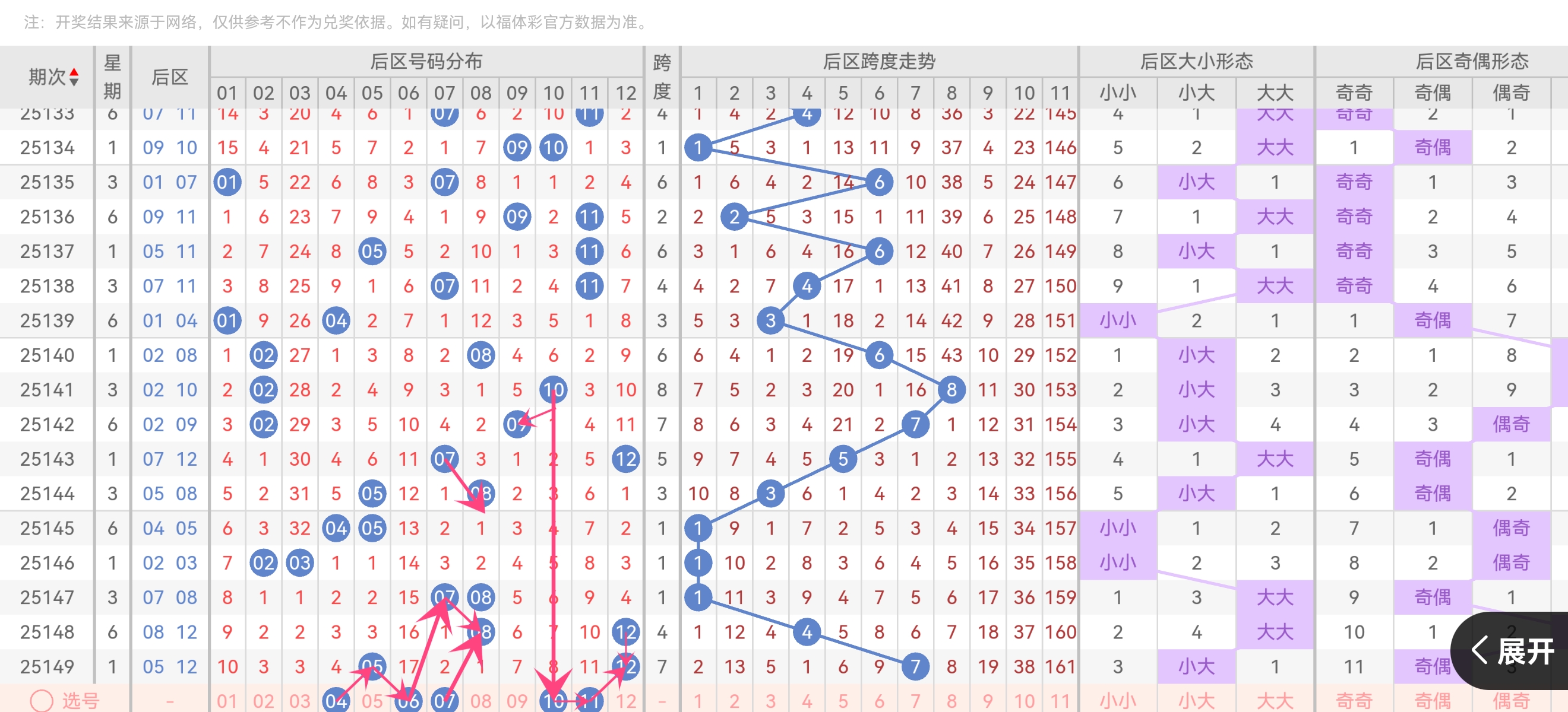 重号出现率:40%(近10期4次)邻号(±1):60%(近10期6次)推荐:回避上期后区05,12,关注邻号04,06,11