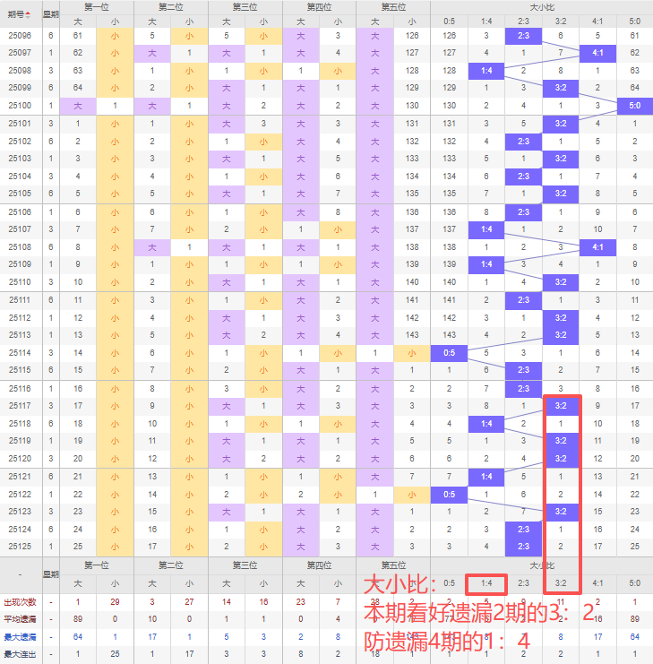 上期大小比:2:3,近10期大小比出现情况:2:3、3:2、1:4、3:2、3:2、1:4、0:5、3:2、2:3、2:3,最近10期出现4期3:2,出现3期2:3,出现0期4:1,出现2期1:4,出现0期5:0,出现1期0:5,根据近10期规律本期看好遗漏2期的3:2,防遗漏4期的1:4,综上所述推荐大小比推荐:1:4,重点关注:3:2。